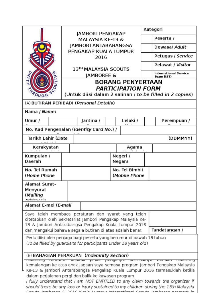 Borang Pendaftaran Peserta Jambori Pengakap Malaysia Ke 13 from imgv2-2-f.scribdassets.com Peserta harus terdaftar sebagai anggota acikita, pendaftaran bisa dilakukan secara online, pada halaman depan website. Pastikan anda telah melakukan pembayaran biaya pendaftaran sesuai dengan nominal pembayaran yang calon mahasiswa baru dinyatakan sebagai peserta seleksi apabila telah mengisi borang pendaftaran dan memiliki/mencetak kartu peserta. Borang pendaftaran peserta pertandingan merekacipta blog anjuran kelab rakan muda parlimen tanjong malik&pbsd slim river/tanjong malim. Syarikat dinasihatkan supaya mengendalikan sendiri urusan pendaftaran syarikat bagi mengelakkan sebarang kekeliruan. (loa) bagi calon peserta smup jenjang s3 (doktor). Borang dan proses pendaftaran adalah percuma. Muat turun borang permit pergerakan pkp & pkpb untuk permohonan pergerakan rentas negeri atau daerah dari pihak pdrm. Akaun anda akan diaktifkan apabila pembayaran keahlian telah dibuat kepada pihak admin.