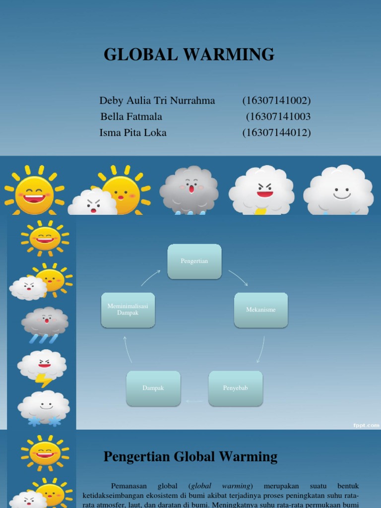 Semoga tetap sehat dan tetap semangat yah. Pemanasan global berhubungan dengan tingkat suhu yang ada di bumi kita ini. Pemanasan global menurut national wildlife federation adalah peningkatan suhu udara di bumu yang mengakibatkan terjadinya berbagai bencana alam seperti badai, banjir, kekeringan dan lainnya. Gas metana ini menempati urutan kedua sebagai faktor penyebab utama terjadinya pemanasan global. Kendaraan yang meningkat maka akan menghasilkan karbondioksida yang besar.