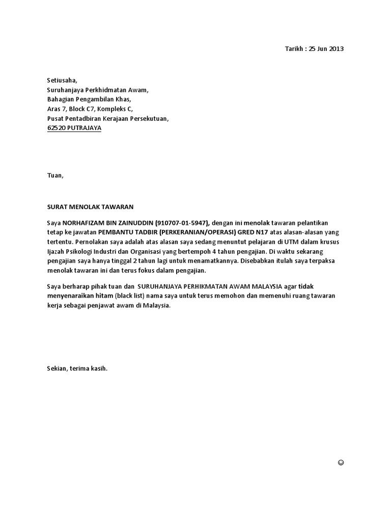 Surat Tolak Tawaran Kerja / Surat lamaran kerja memiliki format dasar yang hampir mirip dengan surat surat lainnya antara lain.. Savesave surat tawaran kerja for later. Mungkin sebagian besar dari kita pernah mengalami kondisi pada saat melamar pekerjaan pertama kalinya sebagai freshgraduate, kita mendapatkan tawaran pekerjaan secara bersamaan dari dua perusahaan yang pernah kita lamar sebelumnya. Ikut contoh surat tolak tawaran untuk latihan industri, internship atau praktikal. Terimakasih pula, telah meluangkan waktu untuk memberikan penilaian terhadap saya dan menjelaskan banyak hal mengenai perusahaan ini. Dari surat lamaran kerja yang anda kirimkan, pihak perusahaan akan menilai anda.