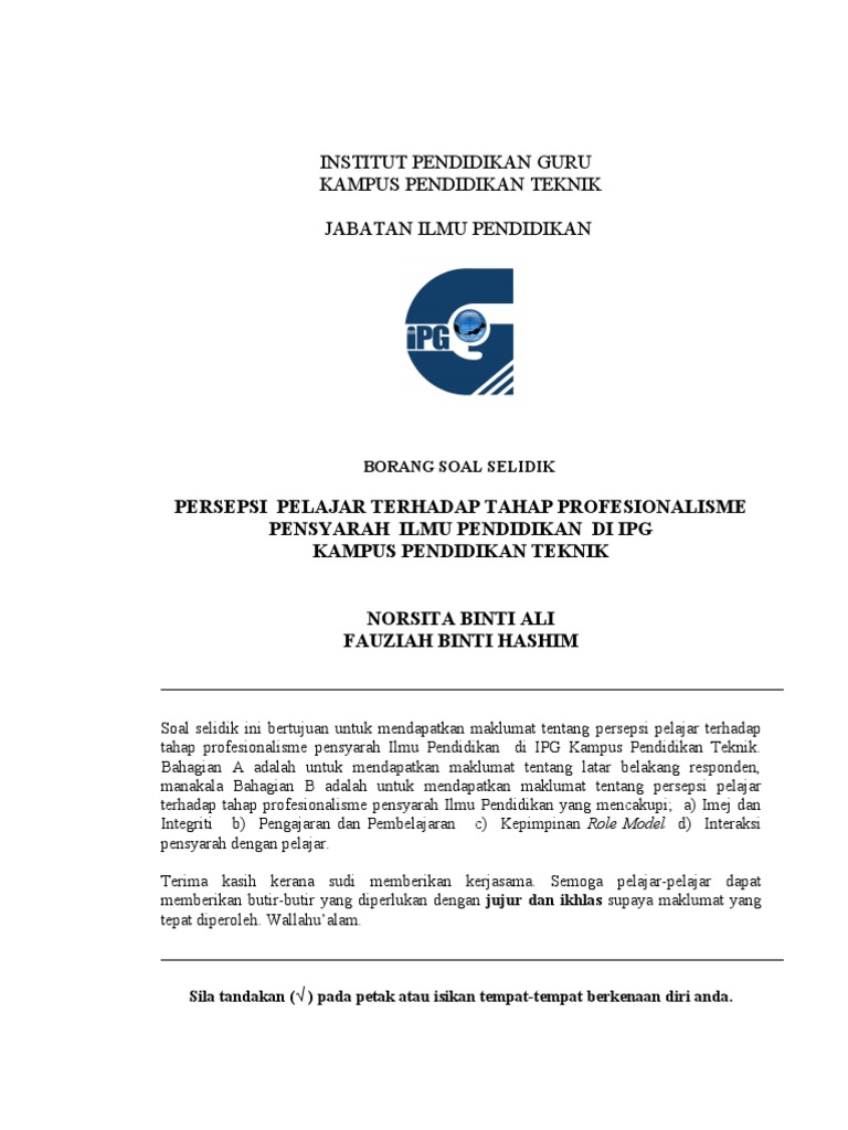 Ipg kampus sarawak jalan bakam, 98009 miri, sarawak tel: Institut pendidikan guru kampus pendidikan teknik lahir setelah proses naik taraf daripada maktab kepada institut dilaksanakan pada bulan. Kamicikguiptek on twitter kami wakil pelajar ipg kampus pendidikan teknik mengucapkan tahniah atas kejayaan twt ipik ipgmalaysia menjayakan larian mesra ipgkpt. Laman web:tp://ipgkba.moe.edu.my/ ipg kampus pendidikan teknik kompleks pendidikan nilai, 71760 bandar enstek, negeri sembilan Rekabentuk kajian berbentuk deskriptif ini menggunakan instrumen soal selidik melalui pendekatan kuantitatif.